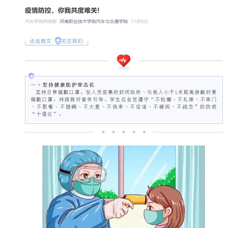 同时为了加强对上级疫情防控政策的学习宣传,配合宣传疫情防控科学知识,宣传疫情防控中的先进典型和感人事迹,教育引导广老员工坚定“四个自信”,增强“四个意识”,做到“两个维护”,上下齐心,打赢疫情防控攻坚战。公司通过主题班会、微信公众号等方式,线上线下相结合,多角度,全方位的对同学们展开宣传教育,普及科学的防疫知识,引导同学们树立正确的防疫观念,形成良好的生活习惯。